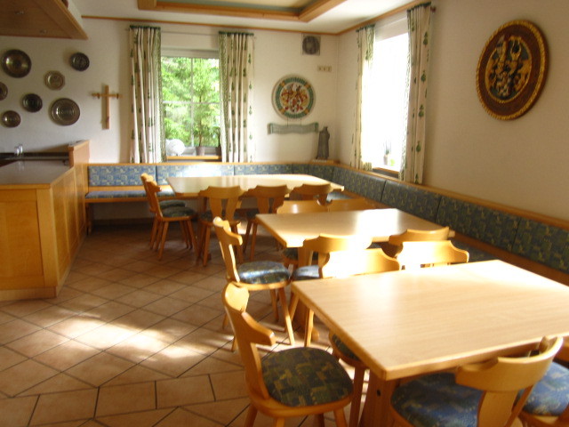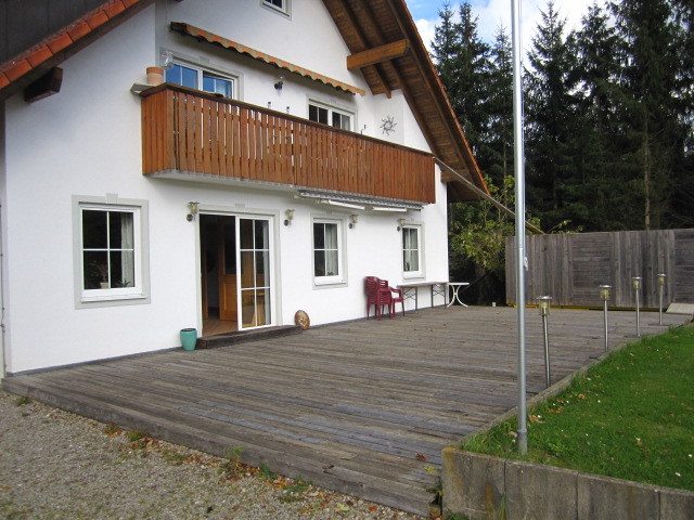Auf der Südseite des Gebäudes ist eine große Holz-Terrasse. Tische und Stühle sind für insgesamt 38 Plätze vorhanden.
